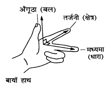 1.फ्लेमिंग के बाय हाथ का नियम:- इस नियम के अनुसार बाय हाथ के अंगुठे,तर्जनी,तथा मध्यमा को इस प्रकार फैलाए कि तीनों परस्पर लंबवत हो।तर्जनी चुंबकीय क्षेत्र की दिशा को,मध्यमा चालक में प्रवाहित धारा की दिशा को,तथा अंगूठा चालक पर लगने वाले बल की दिशा को व्यक्त करती हैं।