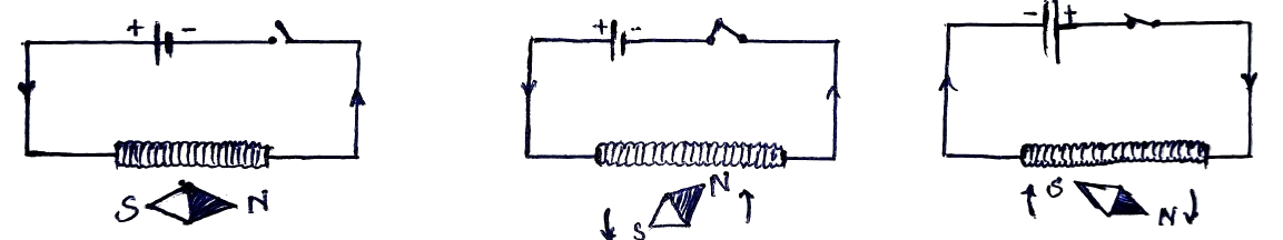 ऑस्टेड का प्रयोग:- सन् 1820 में ऑस्टेड ने धारावाही चालक से उत्पन्न चुंबकीय क्षेत्र के अध्ययन के लिए एक विद्युत परिपथ व एक चुंबकीय सुई ली,विद्युत परिपथ में एक बैटरी ,एक कुंजी व एक धारा नियंत्रक लगा होता है।
