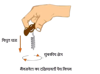 3.मैक्सवेल का पेंच नियम:- इस नियम के अनुसार यदि किसी पेंच को इस प्रकार घुमाया जाए कि उसकी नोक धारा की दिशा में आगे बढ़े तो पेंच को घुमाने की  दिशा चुंबकीय क्षेत्र की दिशा को व्यक्त करती है।