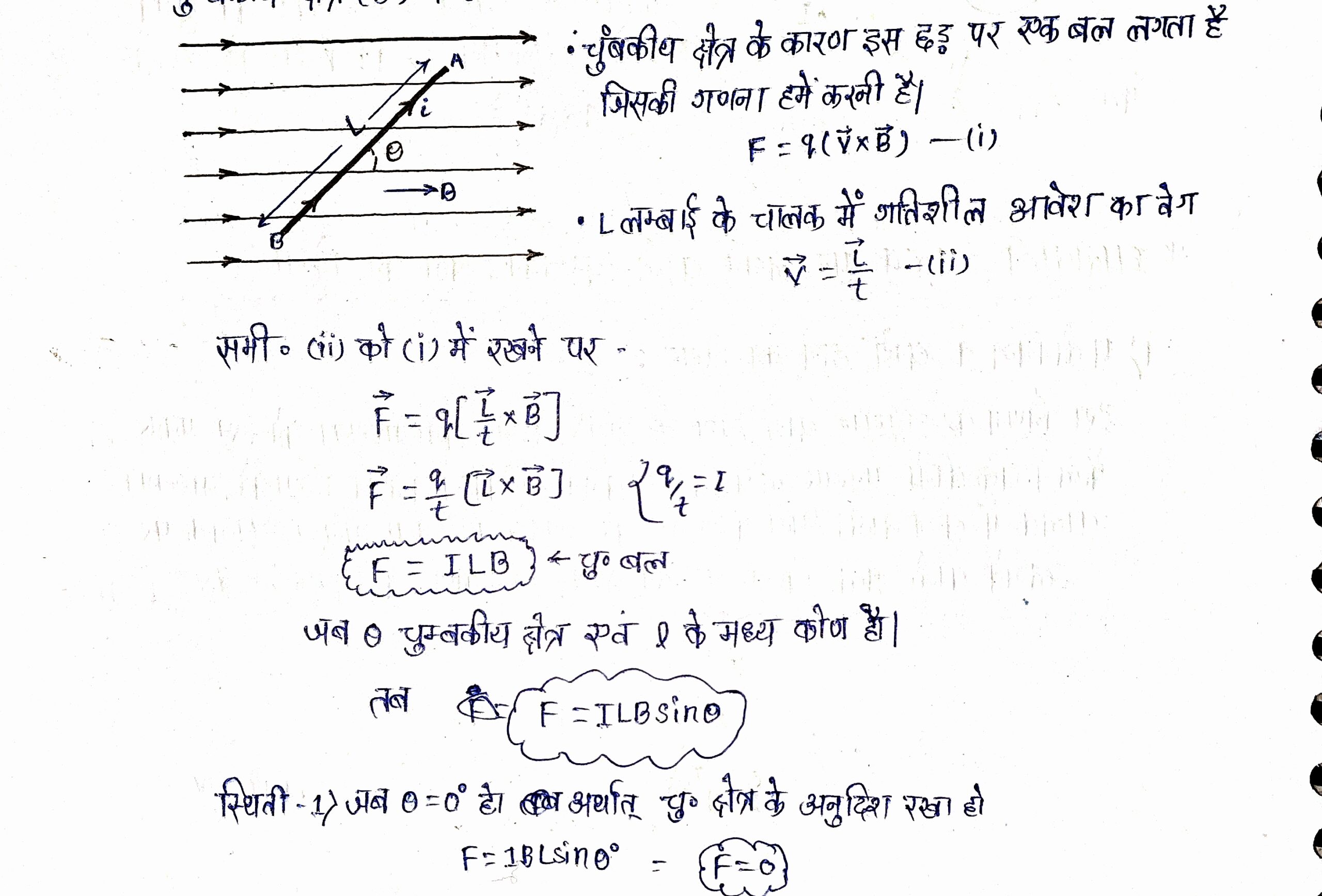 माना एक L लंबाई की छड़ जिसमे I धारा प्रवाहित हो रही हो को एकसामन चुंबकीय क्षेत्र(B) में θ कोण बनाकर रखा जाता हैं।