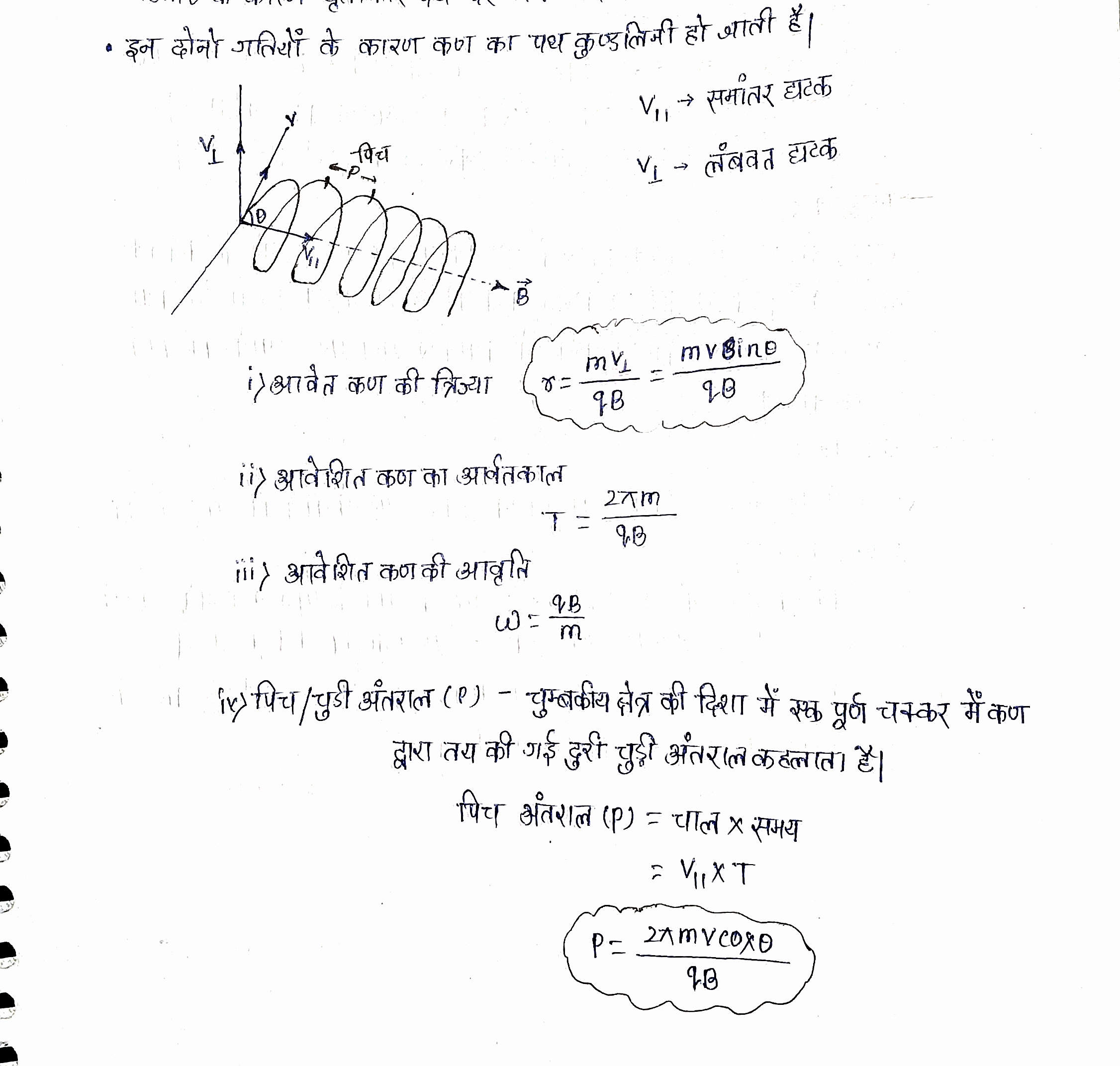 • Vcosθ के कारण कण सरल रेखीय पथ पर गति करना चाहता है परन्तु Vsinθ के कारण वृताकार पथ पर गति करना चाहता है।