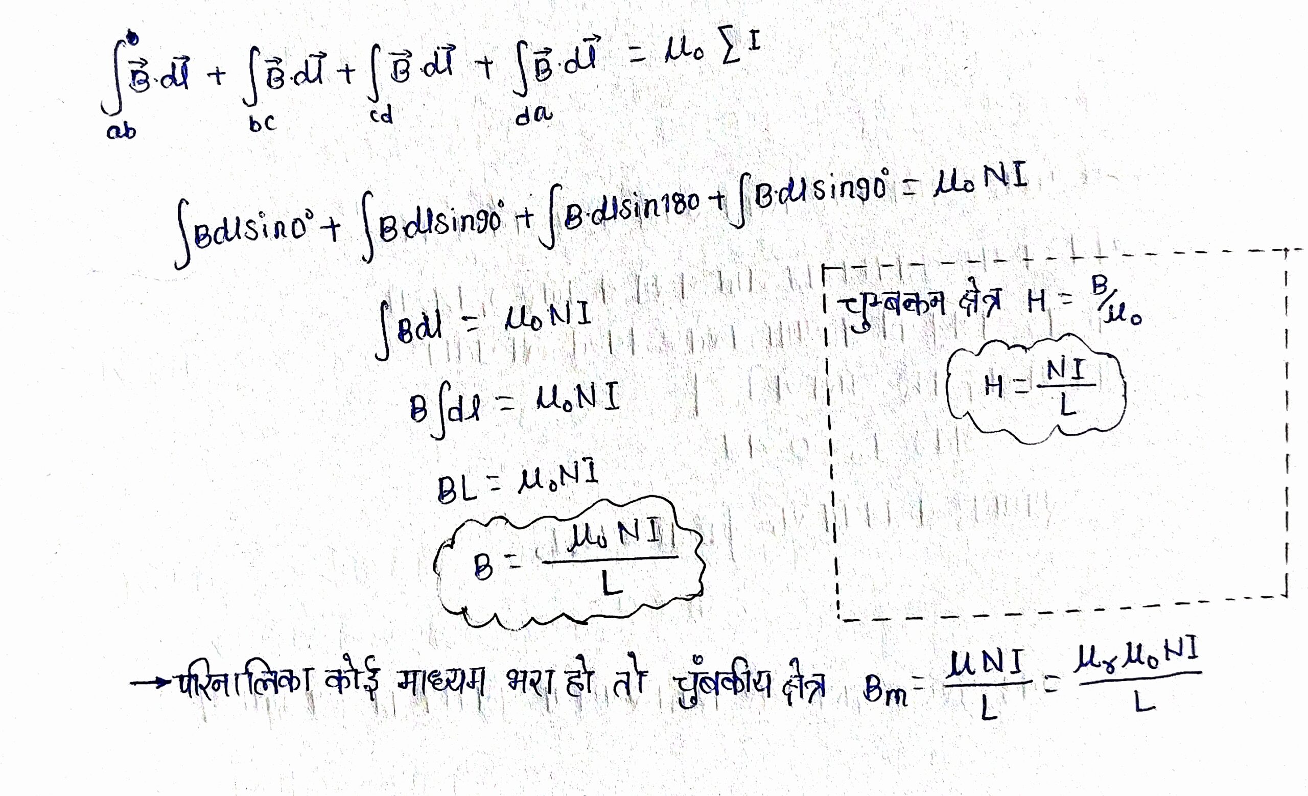 • जहां ∫B•dl – चुंबकीय क्षेत्र का बंद रेखा समकलन