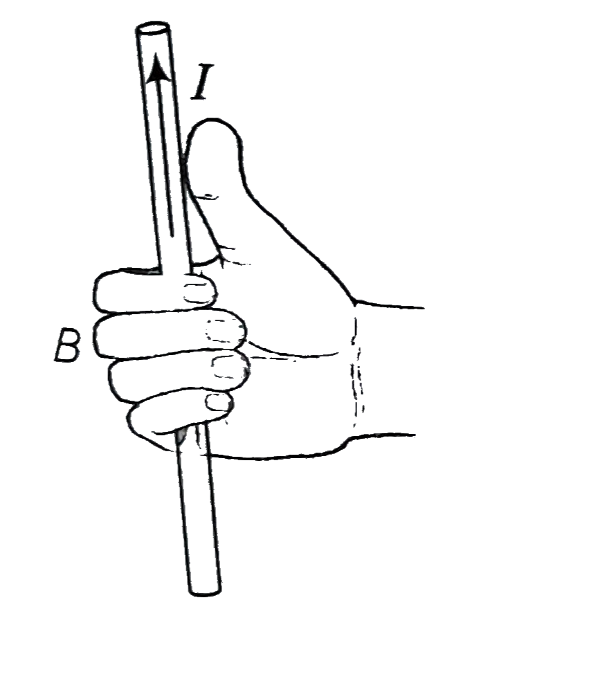 2. दाएं हाथ के अंगूठा के नियम :- इस नियम के अनुसार यदि किसी धारावाही चालक को दाहिने हाथ इस प्रकार पकड़े की अंगूठा धारा की दिशा में रहे तो मुड़ी हुई अंगुलिया चुंबकीय क्षेत्र की दिशा को बताएंगी।