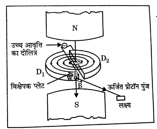 • साइक्लोटान में दो शक्तिशाली विद्युत चुंबक ऊपर से नीचे की ओर चुंबकीय क्षेत्र उत्पन्न करते है।